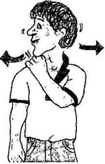 Du imitierst eine Eule, indem du den Kopf so weil wie möglich in jede Richtung bewegst, ohne den Körper mit zu bewegen. Dabei greifst und drückst du mit der linken Hand die rechte obere Seite des Trapezius so fest du kannst. Nach