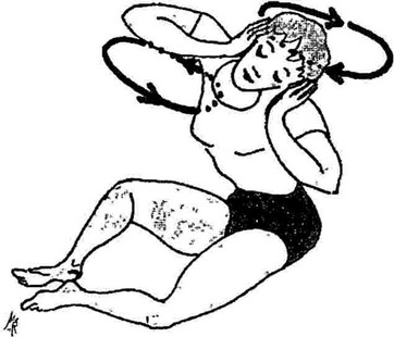 Setze dich auf den Boden, beuge die Knie leicht nach außen und lasse deine Fußsohlen einander berühren. Lege dabei die Fingerspitzen auf die Integrationspunkte über den Ohren. Dann rollst du den Kopf, indem du mit der Nase Kreise in der Luft beschreibst, abwechselnd im Uhrzeiger- und im Gegen-Uhrzeigersinn hin und her - einige Kreise vor der seitlichen Vertikalachse des Körpers, einige dahinter.