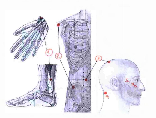 3. Berühre die neurovasculären Punkte (hintere Fontanelle und 2 QF seitlich des Nabels)