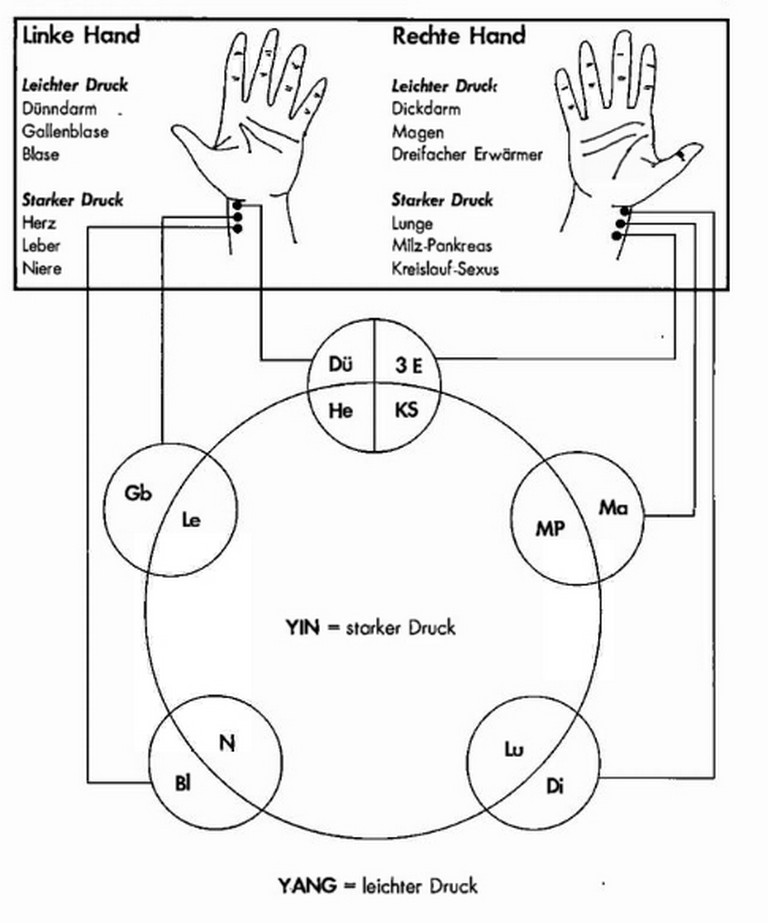 Mit festem °Druck erreichen Sie die im Fünf-Elemente-Scheme innen liegenden Yin-Meridiane.